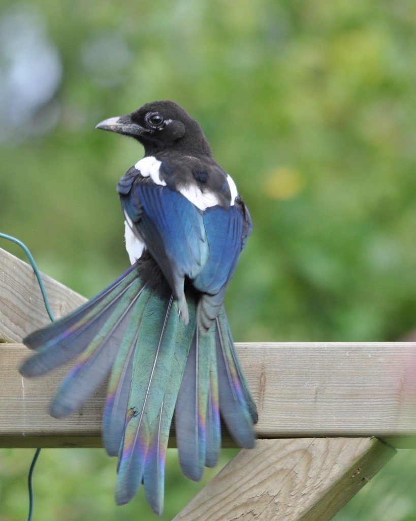 Op deze foto zijn de prachtige staartveren van de ekster goed te zien. In het zonlicht krijgen ze een opvallende glans, met schakeringen van blauw, groen en paars. Een mooi detail van een vogel die vaak wordt gezien, maar waar je pas bij goed kijken echt de schoonheid van ontdekt.